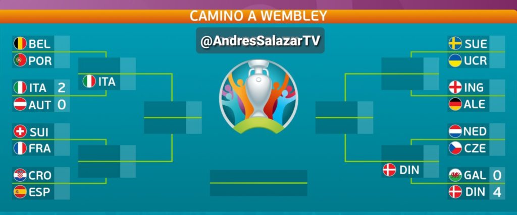 En el otro partido de la jornada, Italia con mucho susto logró vencer en Wembley 2-1 a Austria en la prórroga con goles de Chiesa al minuto 96′ y Pessina al (105”). Para Austria descontó Kalajdzic al (114′).