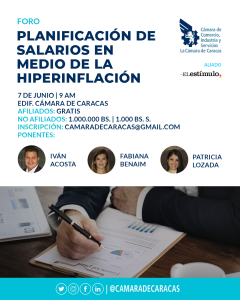 La Cámara de Comercio, Industrias y Servicios de Caracas invita a sus afiliados y a personas interesadas a participar en el foro “Planificación de salarios en medio de la hiperinflación”, que tendrá por objeto analizar de la mano de expertos, cómo están planeando las empresas la gestión de sueldos mientras el país atraviesa una crisis económica.