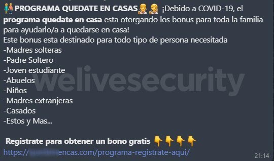 La compañía de seguridad informática ESET, analizó un engaño que ha estado circulando a través de WhatsApp en el que se ofrece una supuesta ayuda en estos tiempos de coronavirus