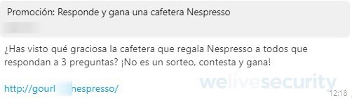 ESET Latinoamérica advierte sobre la circulación vía WhatsApp de un engaño que promete una cafetera Nespresso y luego una Mac Book Pro, y cuyo objetivo es suscribir a la víctima a servicios de SMS premium internacionales.