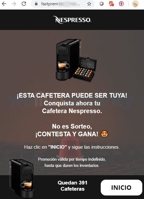 Si el usuario hace clic en el enlace del mensaje, es derivado a una supuesta página de premios y promociones que cuenta con un certificado SSL, sin embargo, la URL del navegador no está relacionada con un sitio oficial de la empresa. Al igual que en campañas similares, con la finalidad de que el usuario no cuente con mucho tiempo para analizar la información y siga avanzando, el número de ítems disponibles -en este caso cafeteras- para regalar desciende rápidamente desde el momento en que el usuario accede al sitio.