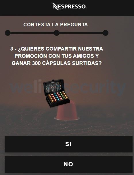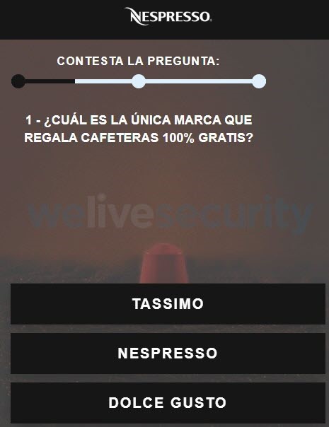 ESET, compañía líder en detección proactiva de amenazas, alerta sobre la circulación activa vía WhatsApp de una nueva versión de una campaña de engaño reportada en abril de 2019. La misma suplanta la identidad de la marca Nespresso para hacer creer a las potenciales víctimas que se está regalando una cafetera a aquellos usuarios que respondan un cuestionario de tres preguntas.