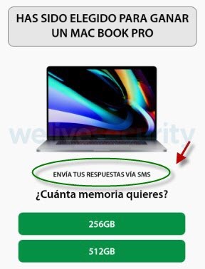 Imagen 6. Mensaje ofrece la posibilidad de ganar una Mac Book Pro, a través de preguntas que debe responder el usuario. Tras completar el cuestionario se envía la respuesta vía SMS