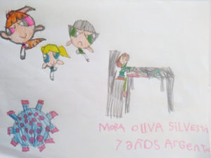 En la imaginación de los niños, el nuevo coronavirus se parece a un villano de caricaturas. Mora Oliva Silvestri retrata cómo la defienden de él las Chicas Superpoderosas