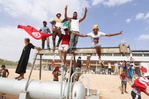 AFP/ FATHI NASRI – Manifestantes tunecinos posan para una foto en la planta de petróleo y gas de el-Kamour, en el estado sureño de Tataouine, en Túnez.