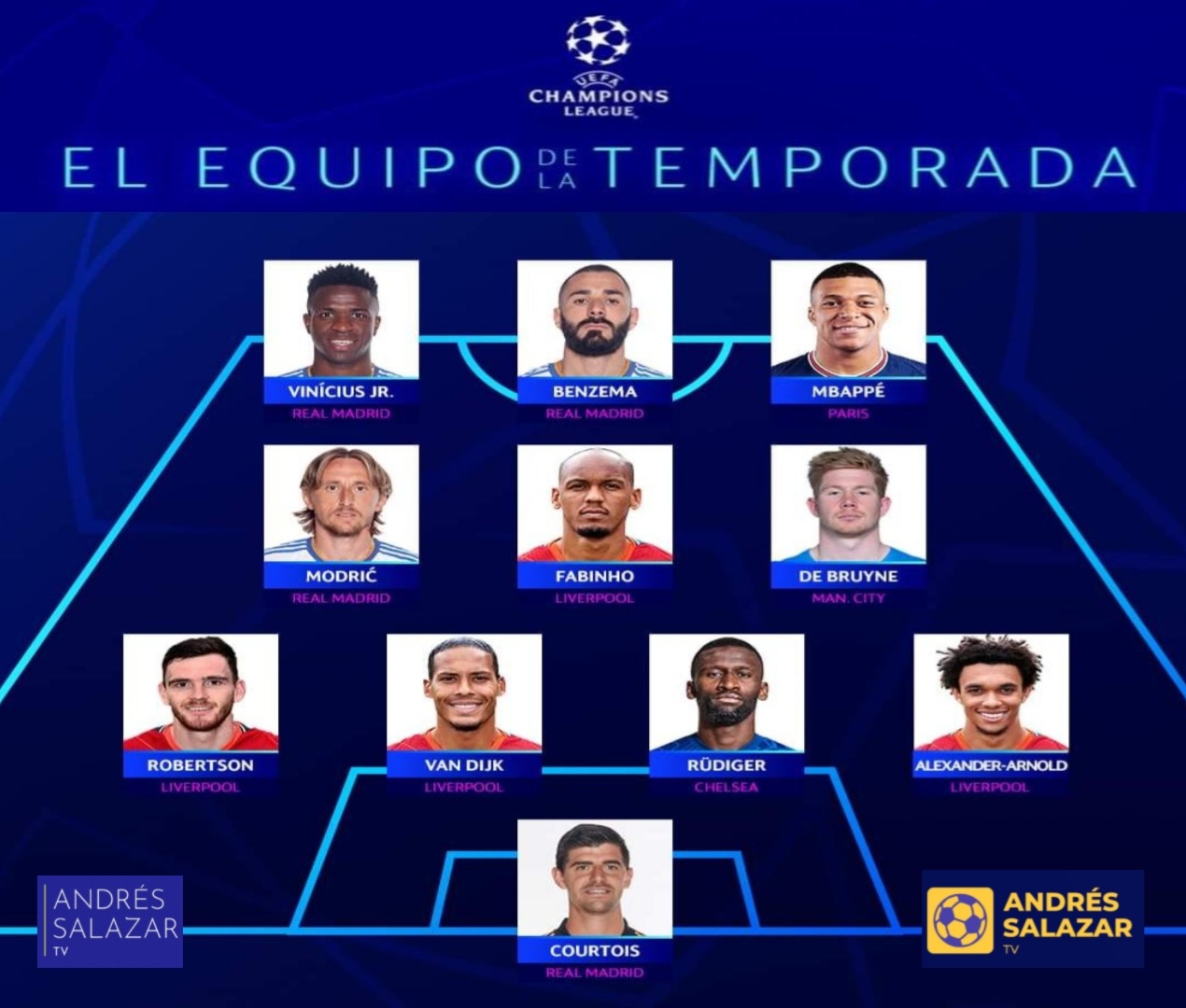 NOTA: El equipo fue seleccionado por el panel de Observadores Técnicos de la UEFA basándose en las actuaciones realizadas durante la temporada 2021/22 en la Liga de Campeones.