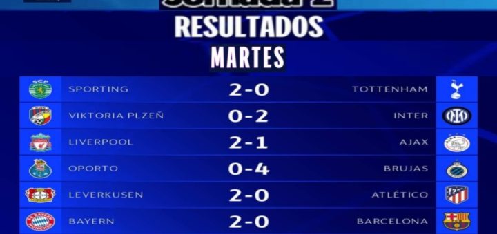 Estos fueron los resultados de este martes 13 de septiembre, correspondientes a la jornada 2 de la Fase de Grupos de la Champions: 🇨🇿 Plzeñ (0-2) Inter 🇮🇹 🇵🇹 Sporting (2-0) Tottenham 🏴 🏴...