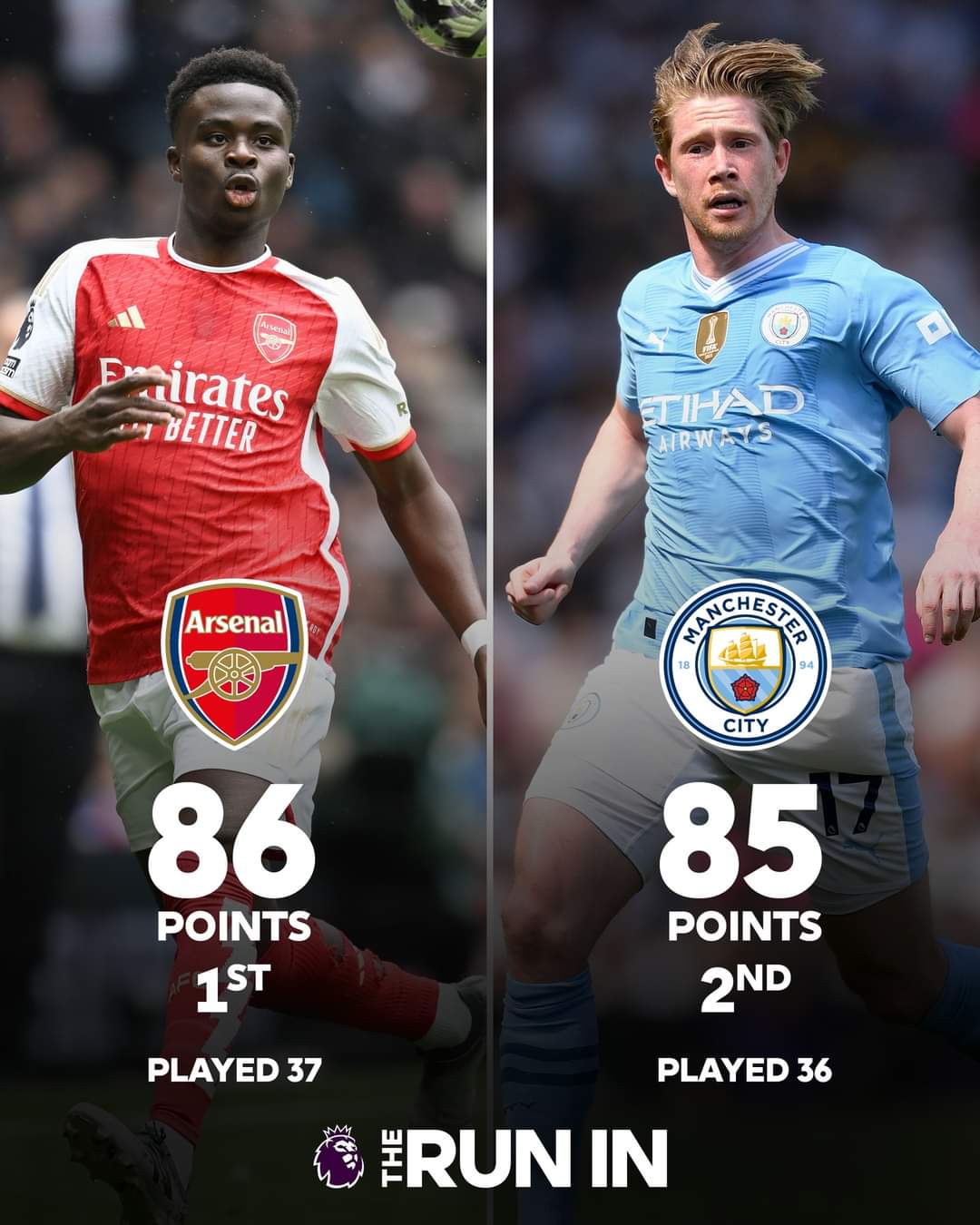 Los Gunners suman con 86 puntos, 1 uno más que Manchester City que es segundo con 85 (con un partido menos).