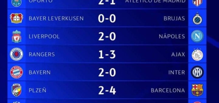 🇩🇪 Leverkusen (0-0)️ Brujas 🇧🇪 🇵🇹 Porto (2-1) Atlético Madrid 🇪🇸 🇩🇪 Bayern (2-0)️ Inter 🇮🇹 🏴 Liverpool (2-0) ️Napoli 🇮🇹 🇨🇵 Marsella (1-2) ️Tottenham 🏴 🇨🇿️ Plzeñ ️(2-4) Barcelona 🇪🇸 🏴 Rangers (1-3)...