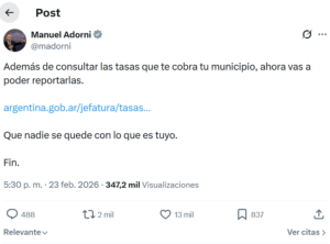 Mediante un comunicado a través de «X» del Jefe de Gabinete Manuel Adorni. El gobierno nacional informó que a partir de ahora además de vez que es lo que pagas y que pagas en tu municipio, vas a poder denunciarlas.