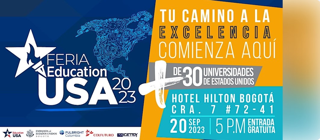 Feria EducationUSA 2023 (miércoles 20 de septiembre, Hotel Hilton, carrera 7 # 72-41, 5:00 p.m. a 8:00 p.m.). Entrada gratuita hasta completar aforo. Registro previo en https://tinyurl.com/3zsh22ny