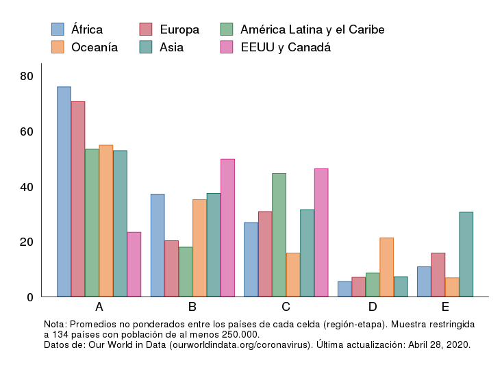 Si bien es demasiado pronto para caracterizar adecuadamente todas las etapas, los datos disponibles hasta ahora sugieren que las olas del COVID-19 puede seguir caminos muy diferentes. El Gráfico 3 muestra el número promedio de días que los países de una determinada región han estado en cada etapa. El hecho de que los países hayan pasado un tiempo breve en las etapas D y E no nos dice mucho, dado que la mayoría sólo llegó a esas etapas muy recientemente. Sin embargo, la duración de las primeras tres etapas, para las cuales ya hay datos más significativos, revela diferencias claras alrededor el mundo.