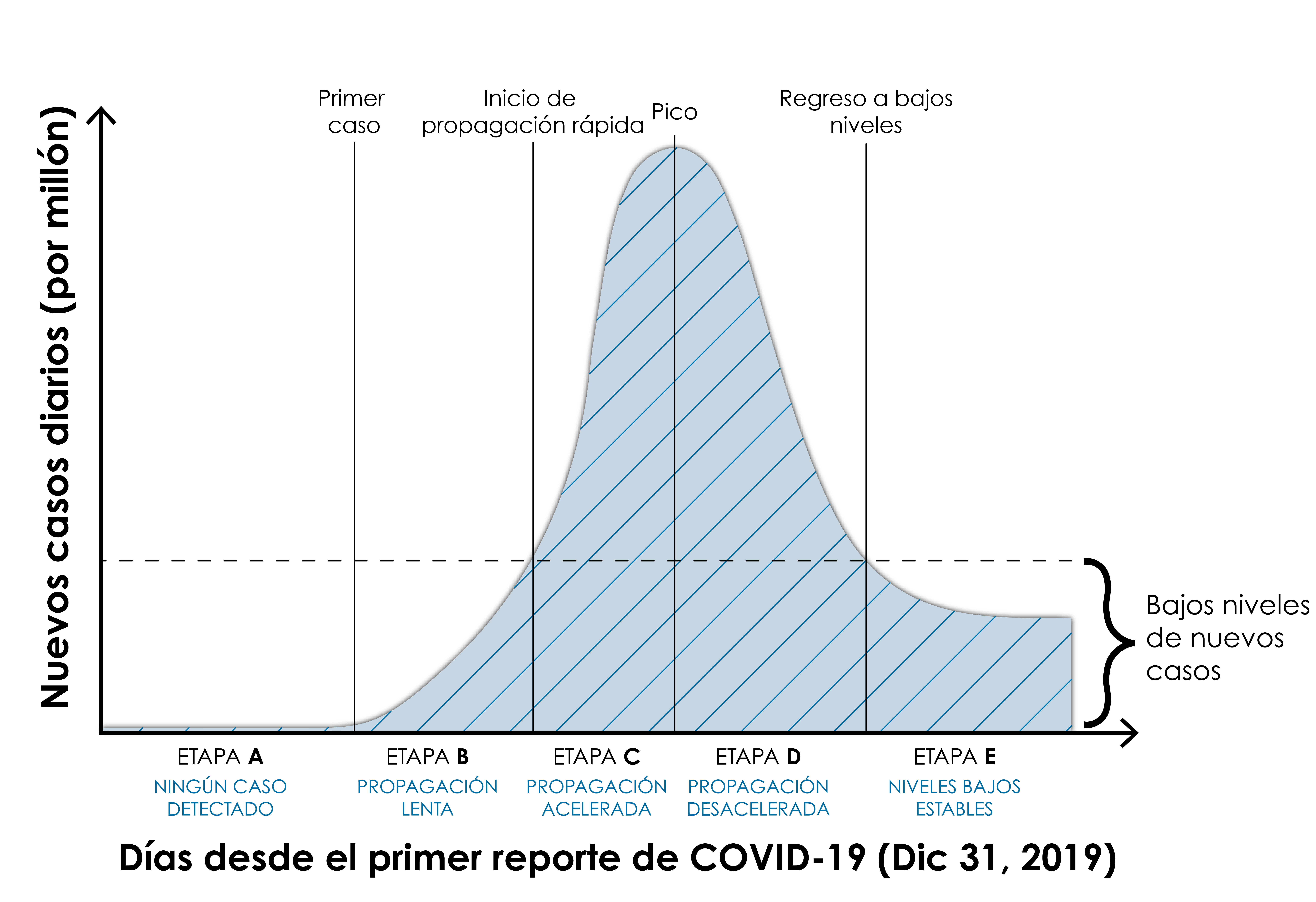 - Etapa E: Niveles bajos estables. El período después de que los casos diarios confirmados disminuyen a niveles bajos (menos de una persona contagiada por millón de habitantes) y dejan de aumentar consistentemente.