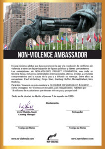Documento de reconocimiento firmado por Víctor Huerta Jouvin, director de la Fundación Non-Violence en Ecuador, con espacios para firma de autoridades locales.