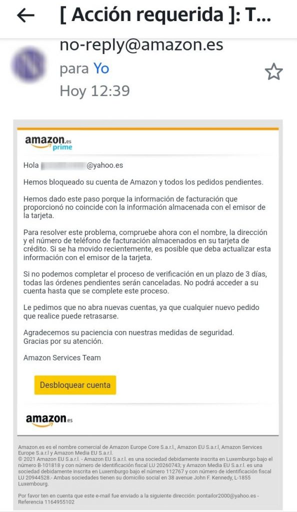 Pie de imagen: Phishing de Amazon por supuesto bloqueo de cuenta. Fuente: Twitter/@J_P_Johnson