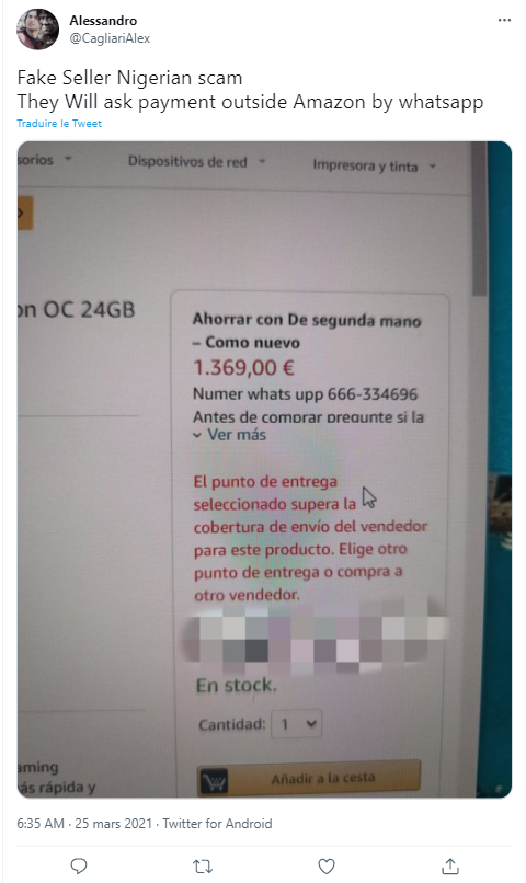 Estafas de pagos y ofertas increíbles: Las estafas relacionadas con los pagos buscan obtener información de una cuenta bancaria y/o dinero. Una táctica que se utiliza a menudo es tratar de convencer al usuario de que pague por fuera de la plataforma segura de Amazon. Los delincuentes intentarán atraer a la potencial víctima de varias maneras. Por ejemplo, ofreciéndole un descuento si paga por fuera de la plataforma. Sin embargo, si cede, el resultado más probable es que se pierda el dinero y que el producto nunca llegue. Y, además, no podrá presentar una queja ante Amazon, ya que realizó el pagó por fuera de los límites de su plataforma.