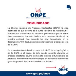 Añadió que la ONPE ha sido notificada que el Pleno de la Junta Nacional de Justicia (JNJ) aprobó por unanimidad la renuncia presentada por Piero Alessandro Corvetto Salinas a la Jefatura Nacional, acuerdo que ha sido formalizado mediante la Resolución N.º 119-2026, que declara la vacancia al cargo de jefe de la ONPE.