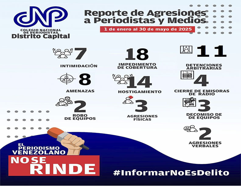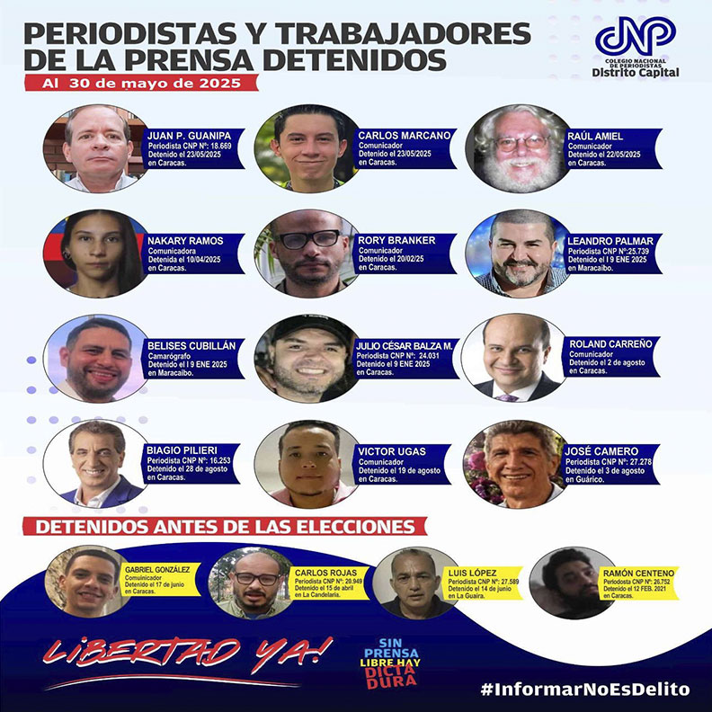 “Celebrar el Día del Periodista, el próximo viernes 27 de junio, es difícil por el ambiente hostil, de agresiones, amenazas contra la prensa y 16 periodistas presos” declaró Edgar Cárdenas, secretario general del CNP, seccional Distrito Capital.