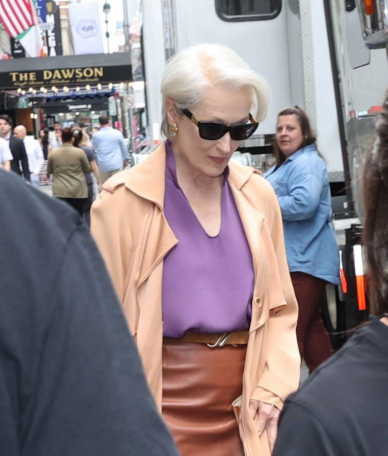 El outfit de Meryl incluyó un trench beige, blusa púrpura, falda lápiz de cuero en color café y lentes oscuros oversize, elementos que replican el estilo elegante e imponente con que fue concebido para la película original de 2006.