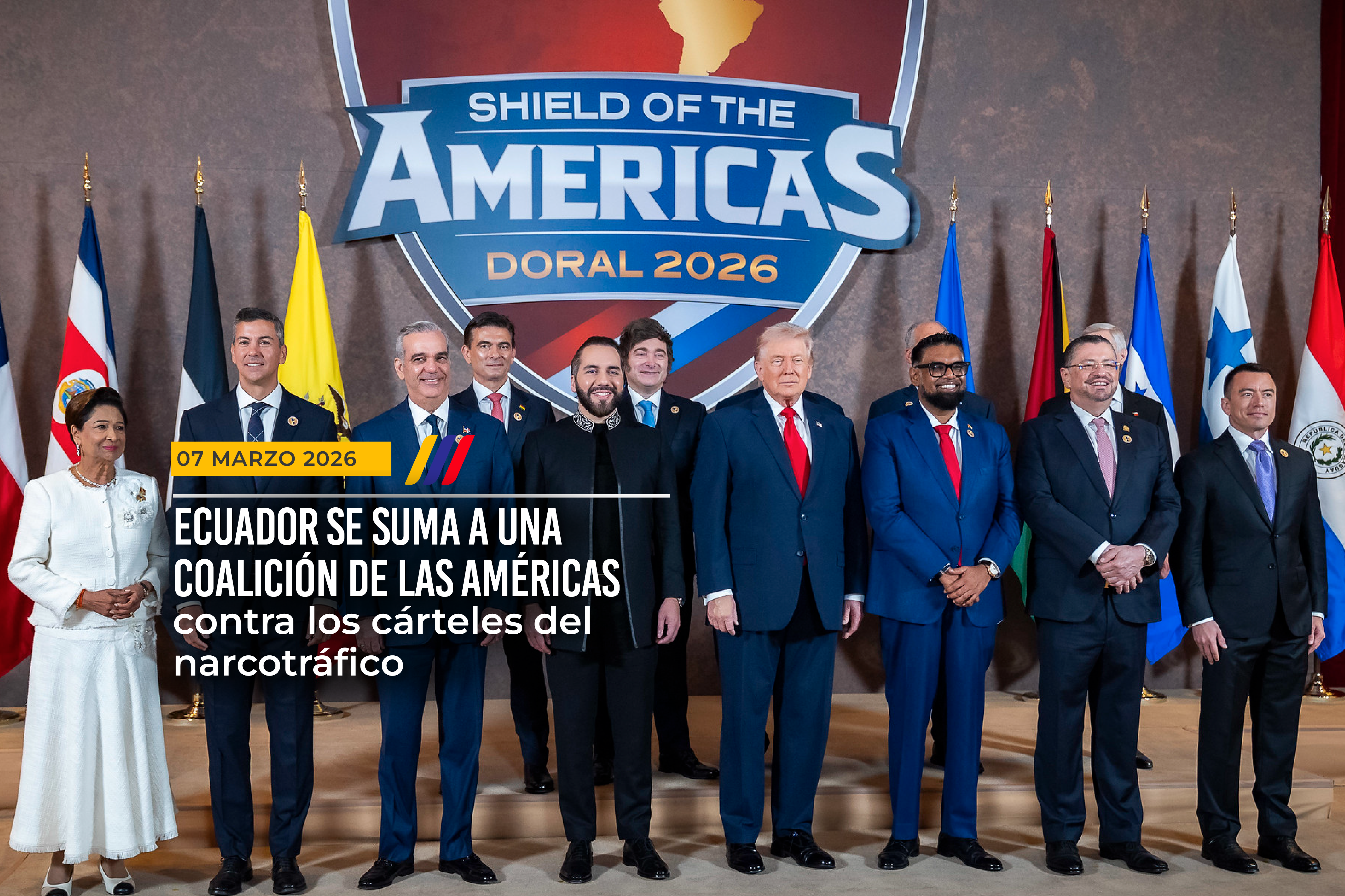 El presidente de la República del Ecuador, Daniel Noboa Azin, participó este 7 de marzo en la cumbre presidencial “Shield of the Americas Summit”, convocada por el presidente de los Estados Unidos, Donald Trump. En el marco de este encuentro, se adoptó la Declaración que conforma una coalición de las Américas a favor de la democracia y la soberanía, y en contra de los cárteles del narcotráfico y las economías ilícitas.