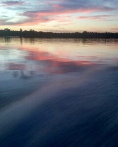 Al atardecer, con el incendio voraz provocado por el sol entre las nubes gozan los sentidos. Surcan las curiaras como lo han hecho desde hace más de tres mil años. Nono (tierra) huele a moriche y el Orinoco a cacao de agua. En las llamas del ardiente cielo se funden la realidad con la leyenda. Es la tierra del diluvio y de los dioses. Mueren las antorchas del campamento. Desde los tupidos matorrales chillan los araguatos y reptan las culebras. La brillante y oscura bóveda estrellada cubre la selva. Yo, criatura de ciudad, temo más al vaivén del chinchorro con mosquitero que a los bichos y encantos. Me encomiendo. La selva, manglares y morichales del delta del Orinoco son regalos benditos que redimen el alma de quienes deseamos ser redimidos.