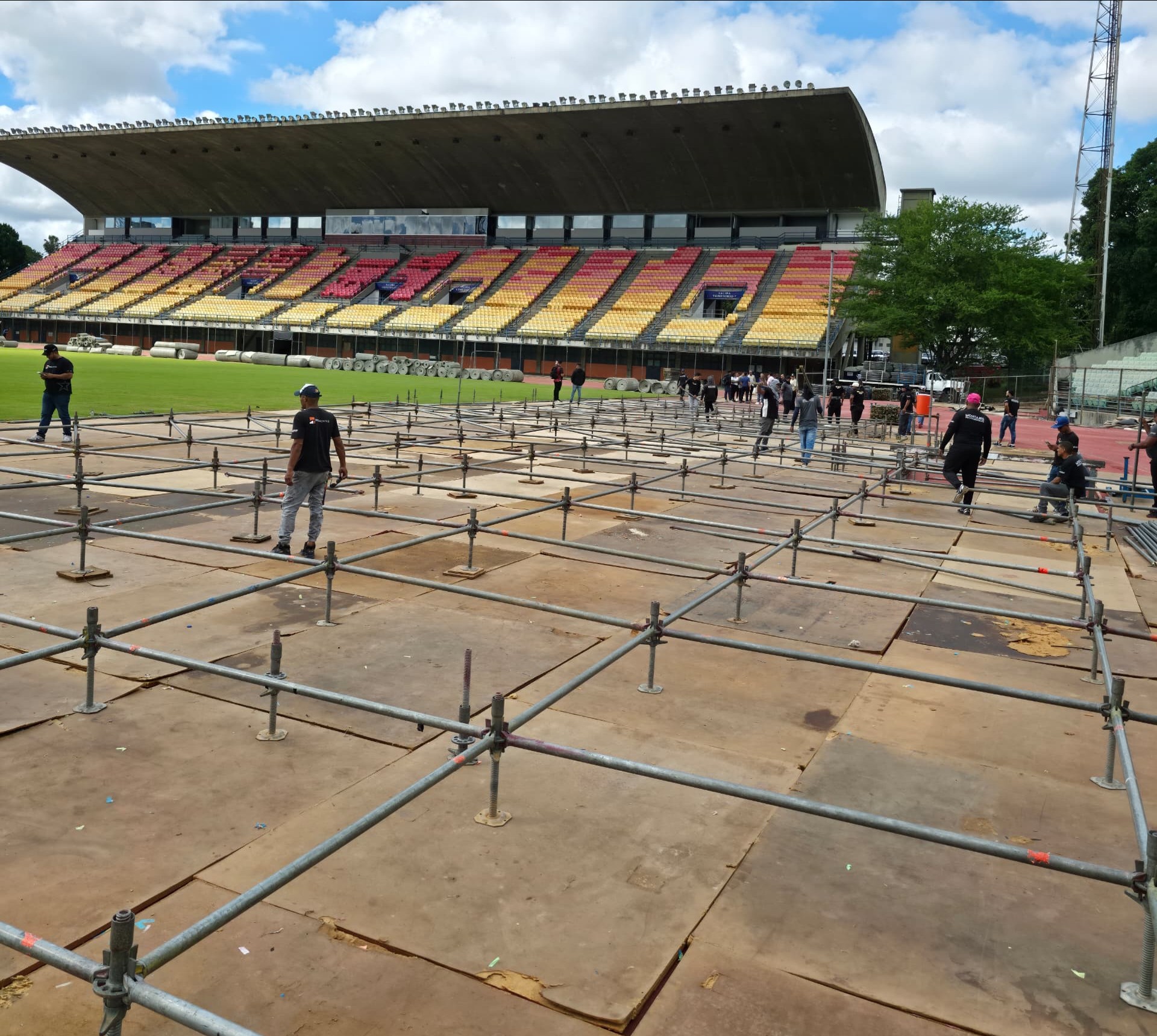 CP Producciones ha comenzado el montaje del esperado concierto de la Fiesta de JA, que se llevará a cabo el próximo 13 de diciembre en el Estadio Olímpico de la UCV. Carlos Pereira, junto a un increíble equipo de trabajo, ya se encuentra en el recinto deportivo afinando los últimos detalles para este mega concierto.